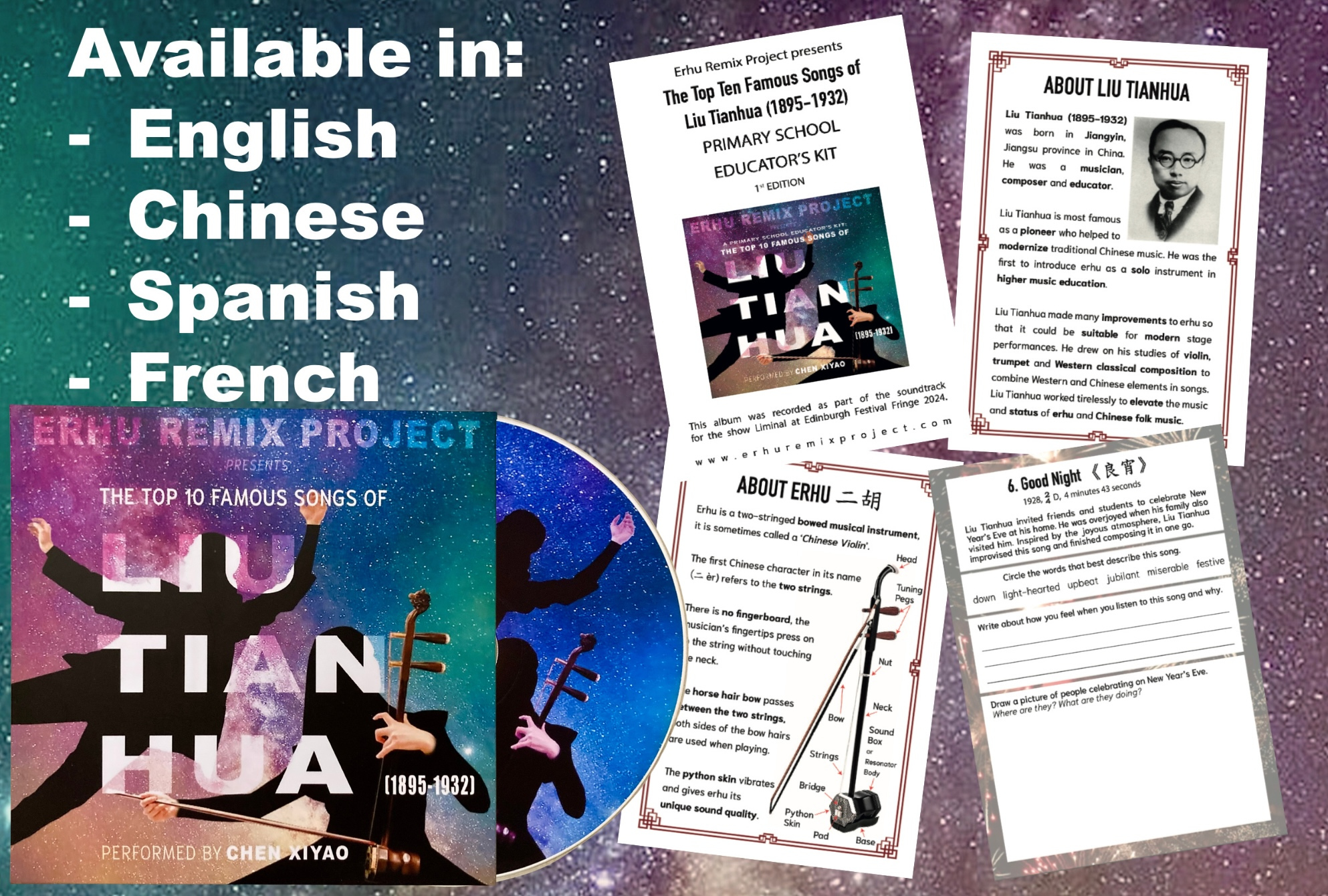 We also produced a music album, The Top Ten Famous Songs of Liu Tianhua (1892-1932), accompanied by a Primary School Educator's Kit. The goal was to create a multilingual teaching resource to introduce primary school children to the erhu music of Liu Tianhua. It was available in English, Chinese, Spanish and French. The kit contained posters introducing erhu and Liu Tianhua, and each of the ten songs had a corresponding worksheet which featured a short informative text about the song, a vocabulary building exercise, a writing prompt and a creative prompt to help young audiences express their own reponses to new music.
